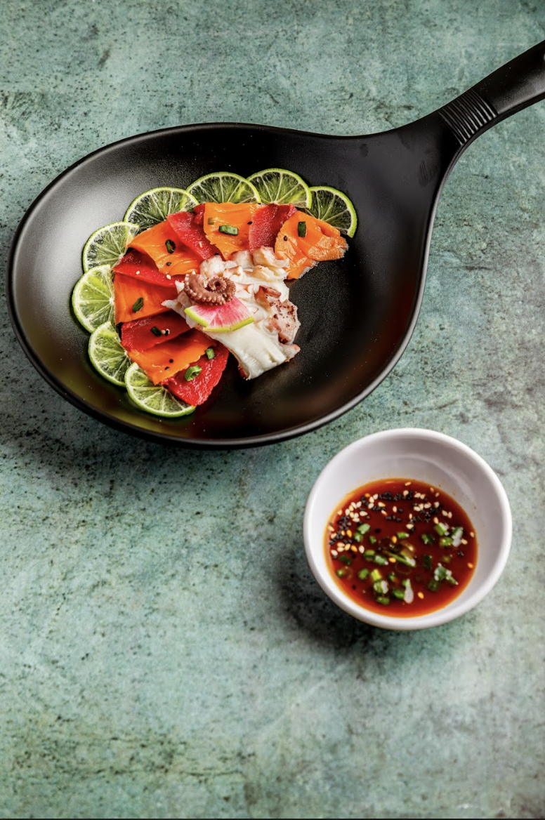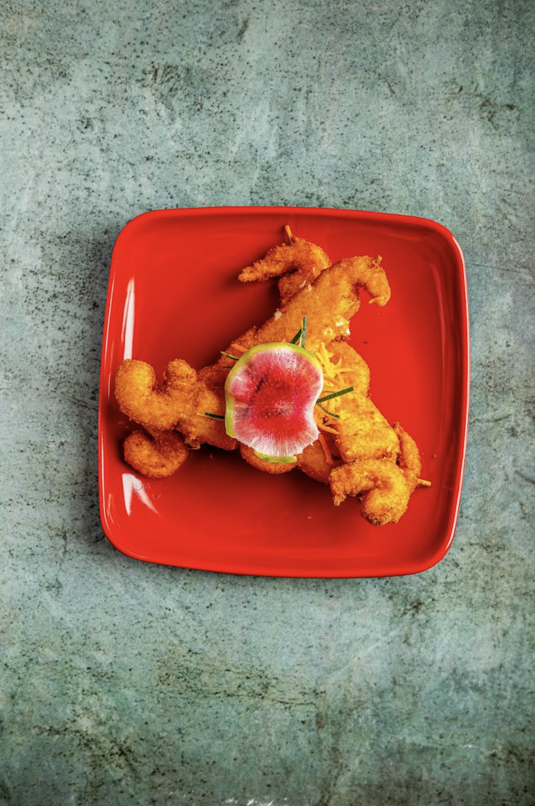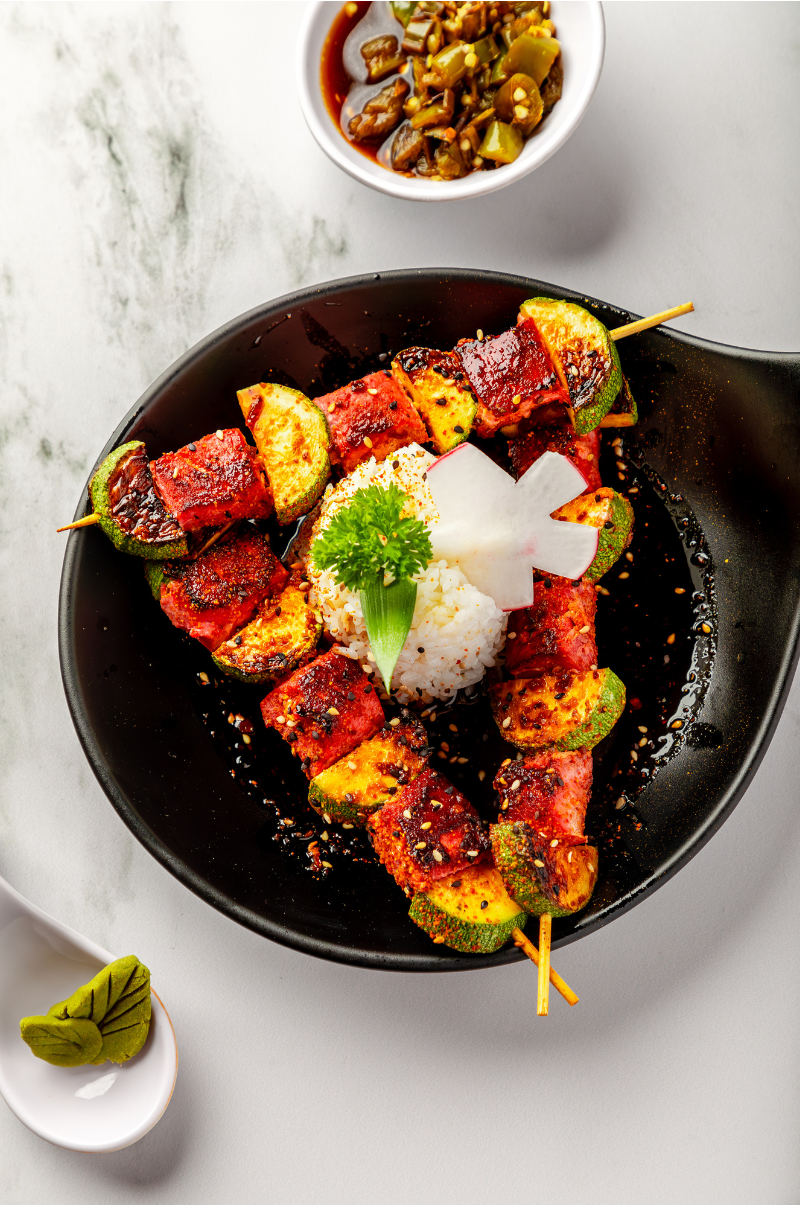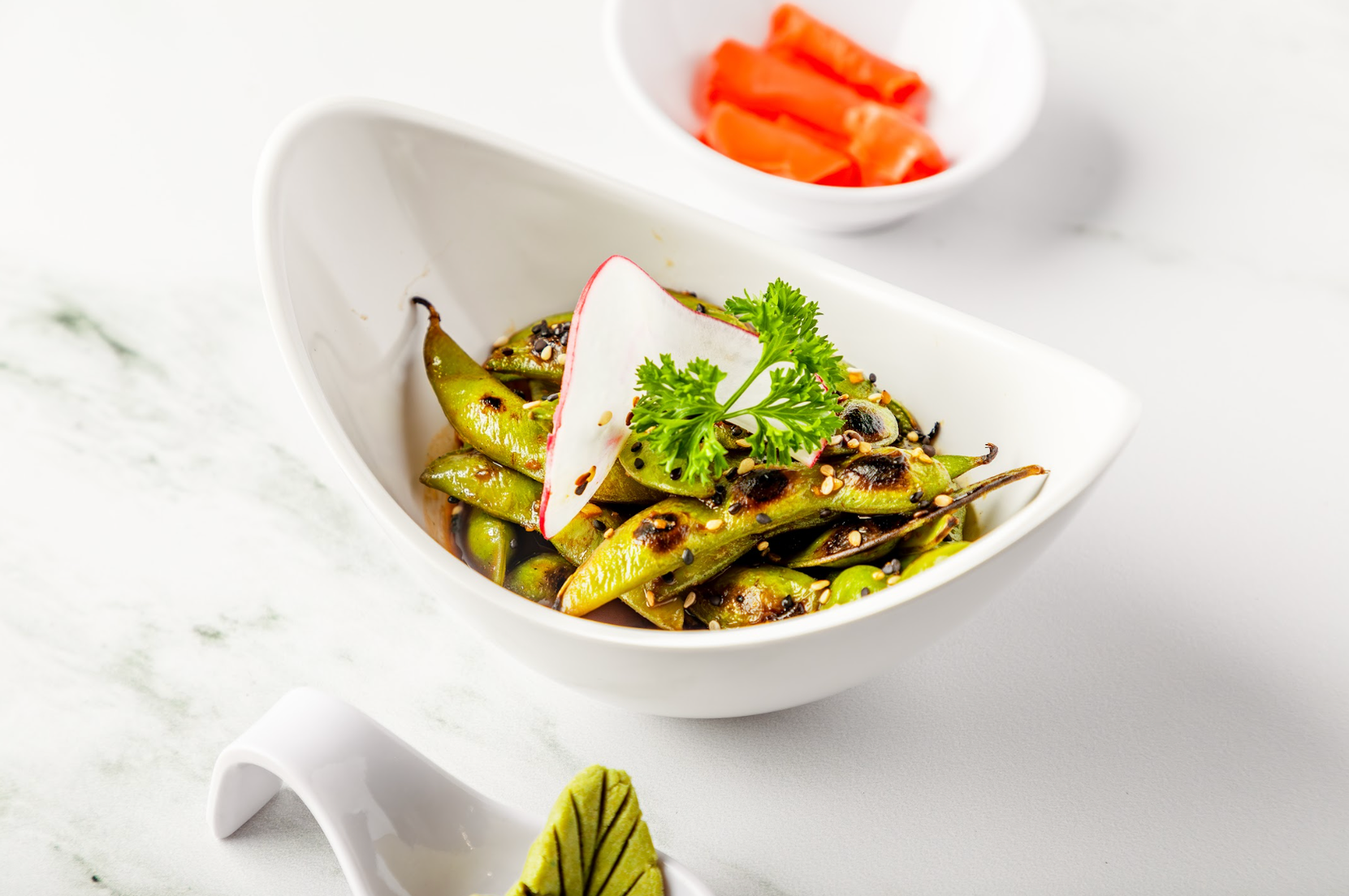 A la plancha, bañadas con salsa de anguila, calabaza, sashimi togarashi y ajonjolí, terminadas con salsa tatake.