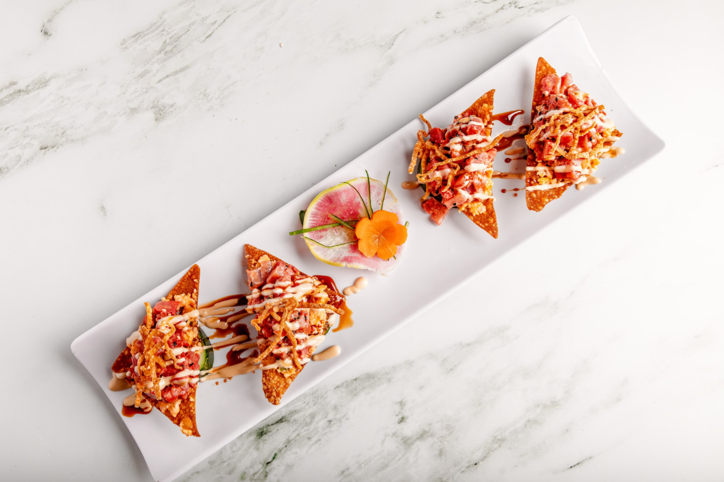 4 tostaditas wonton con ensalada de atún, ensalada dinamita, salsa de anguila y aderezo de cacahuate.