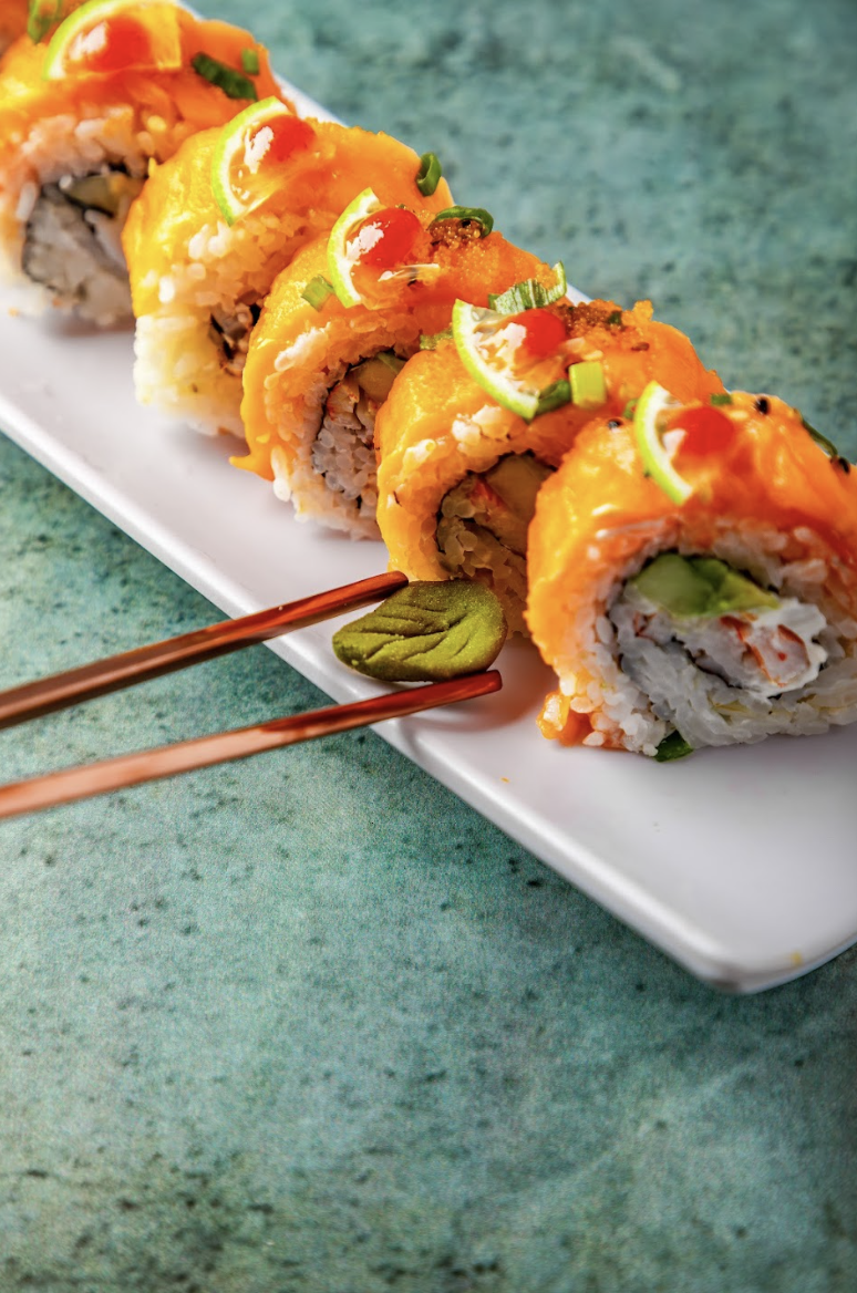 Por fuera: salmón 80 grs., cebollín, ajonjolí, masago, láminas de limón, bañado con salsa tatake y un toque de sriracha.