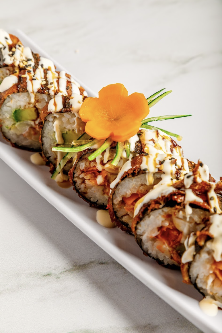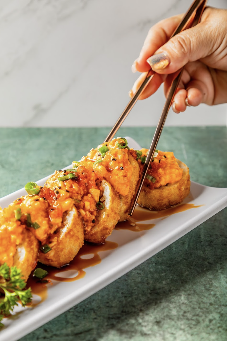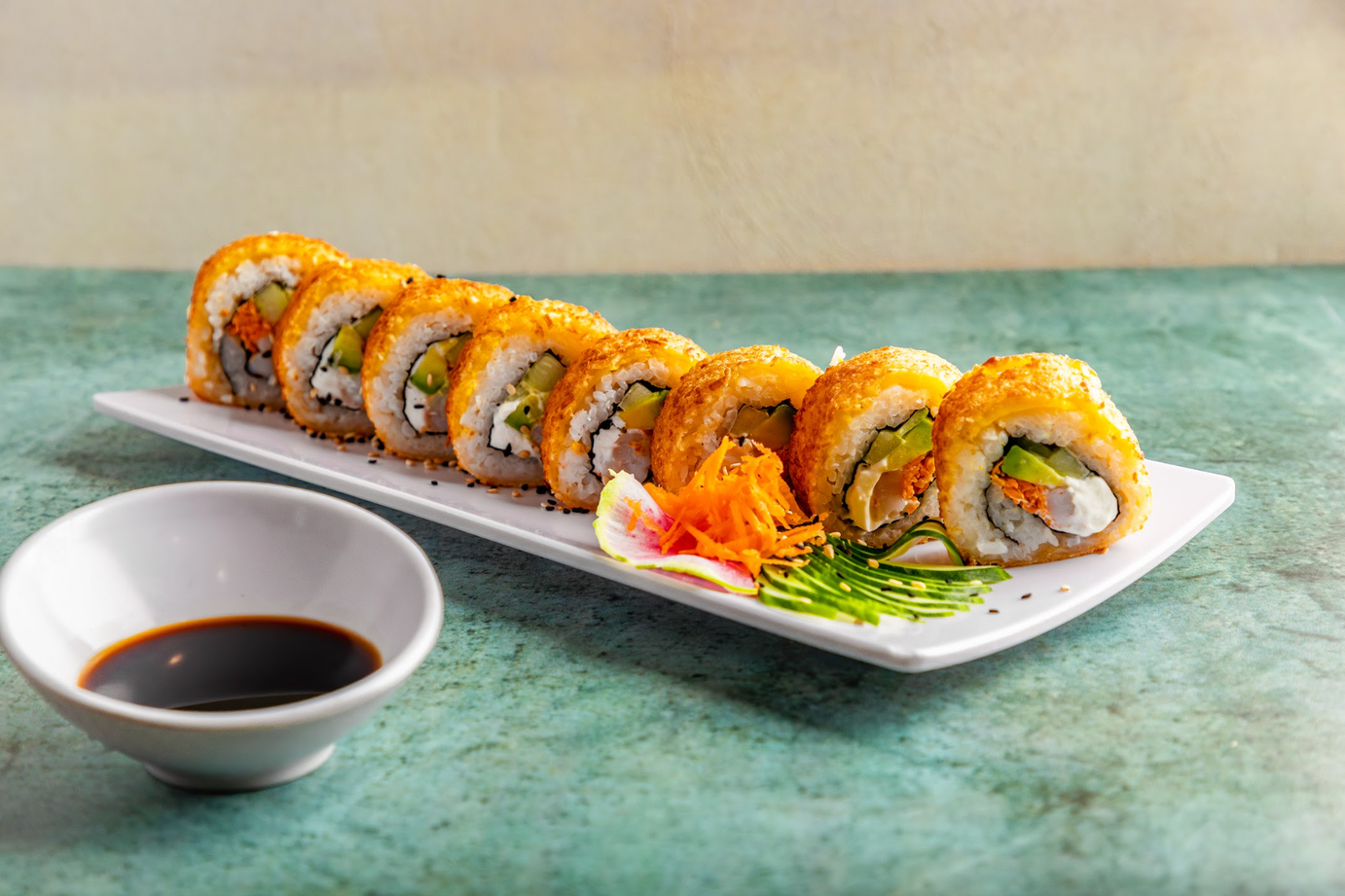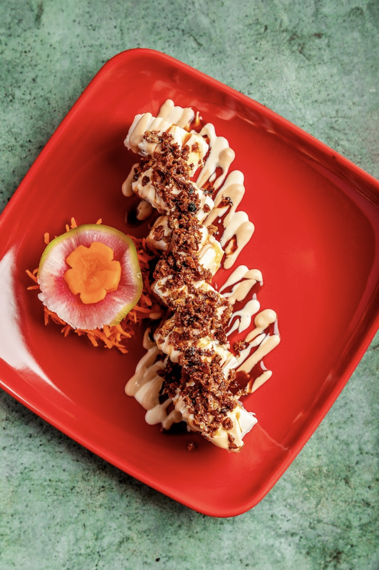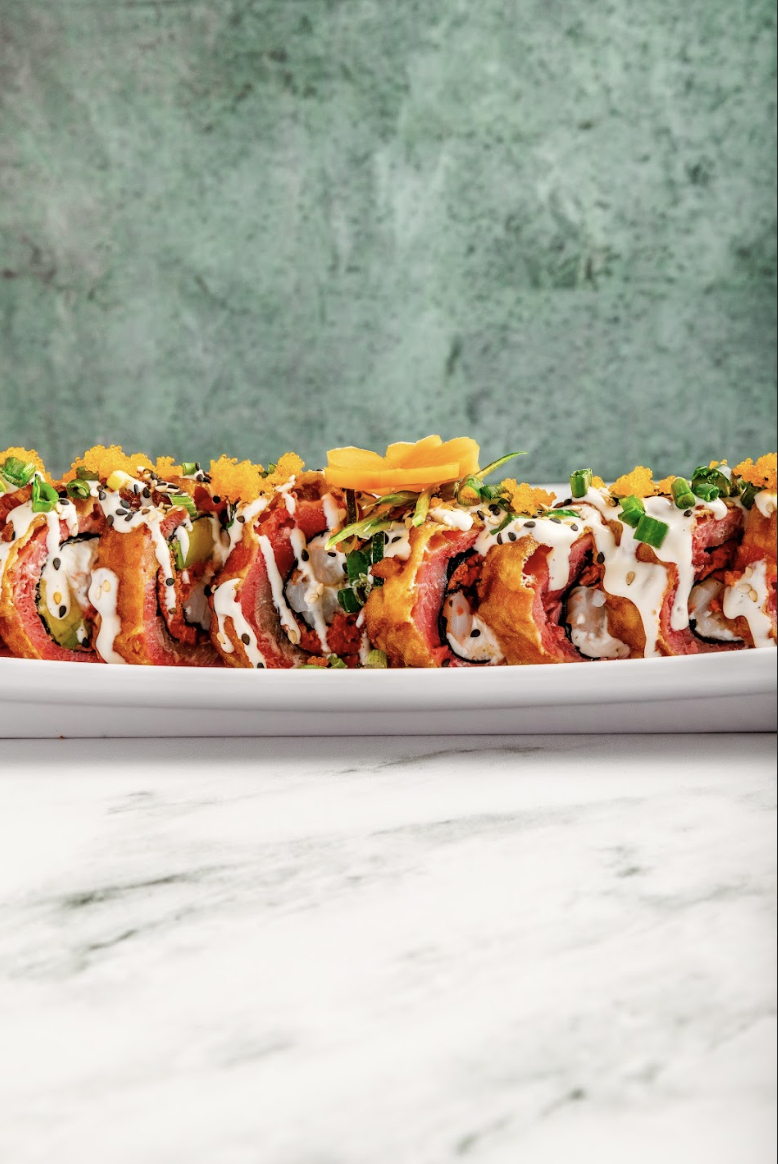 Por fuera: atún 120 grs., estilo tempura, bañado con mayonesa envinagrada, cebollín y masago 15grs.