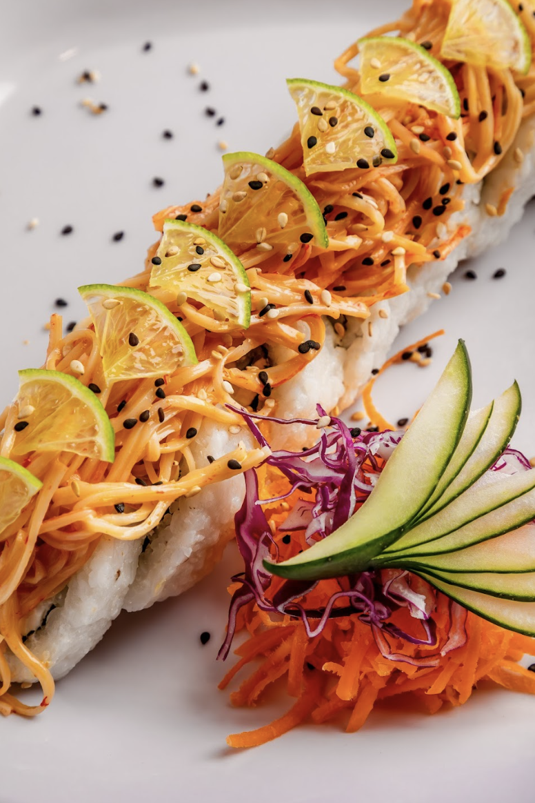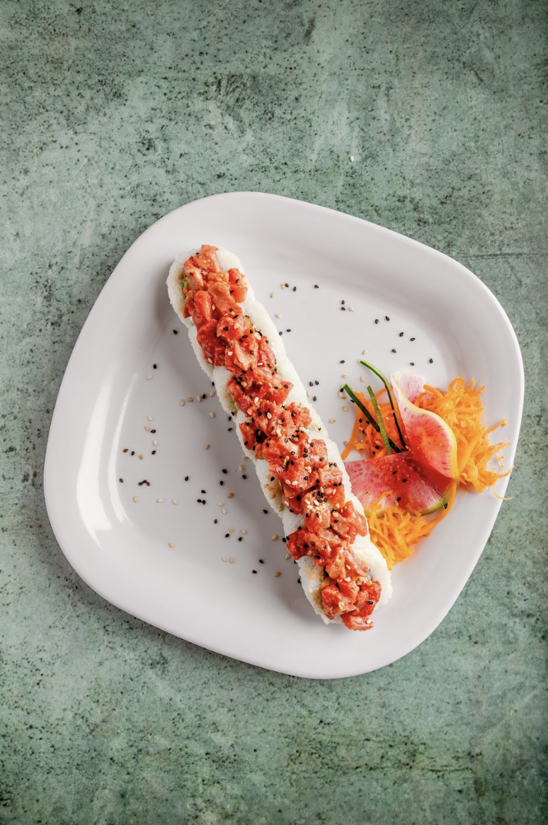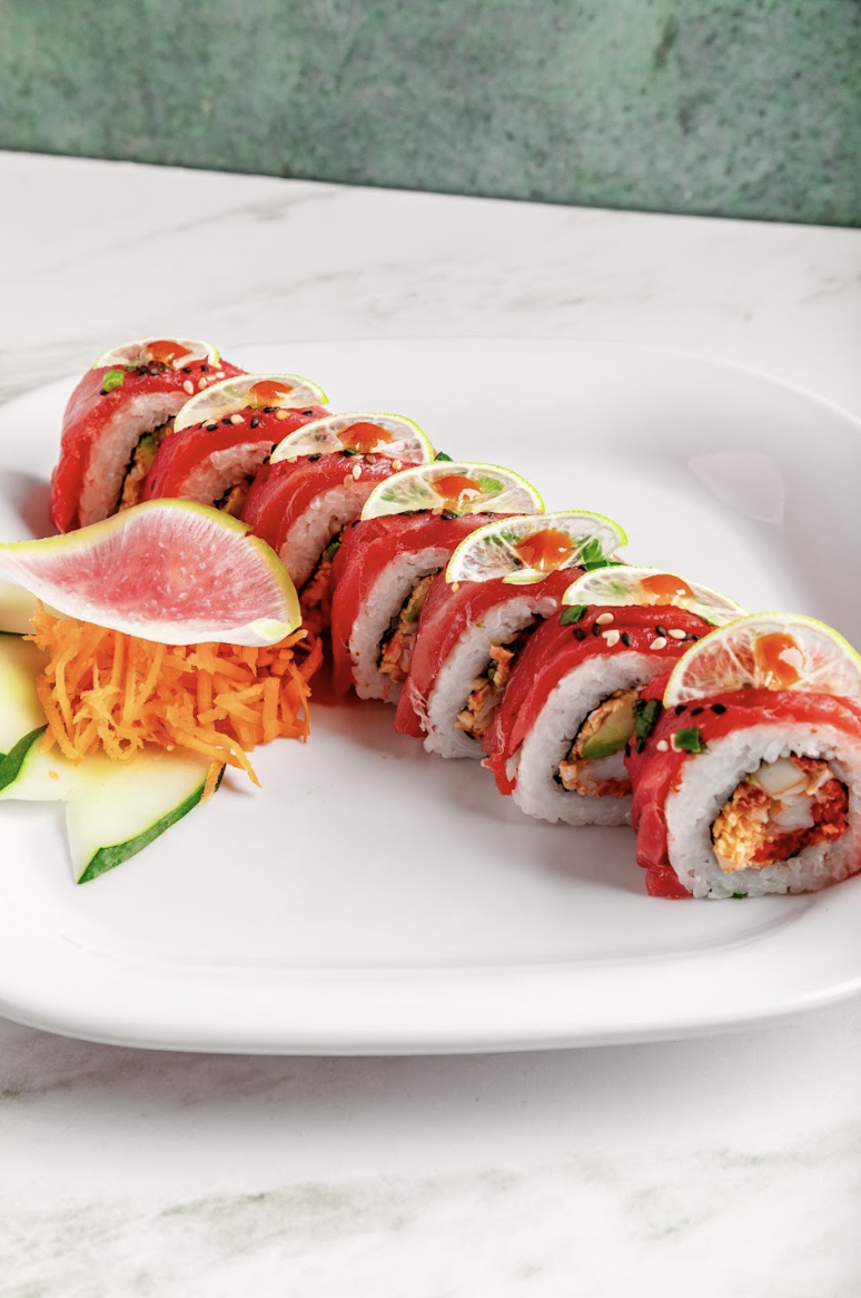 Por fuera: atún fresco 80grs., láminas de limón, un toque de sriracha, cebollín, ajonjolí, bañado en salsa.